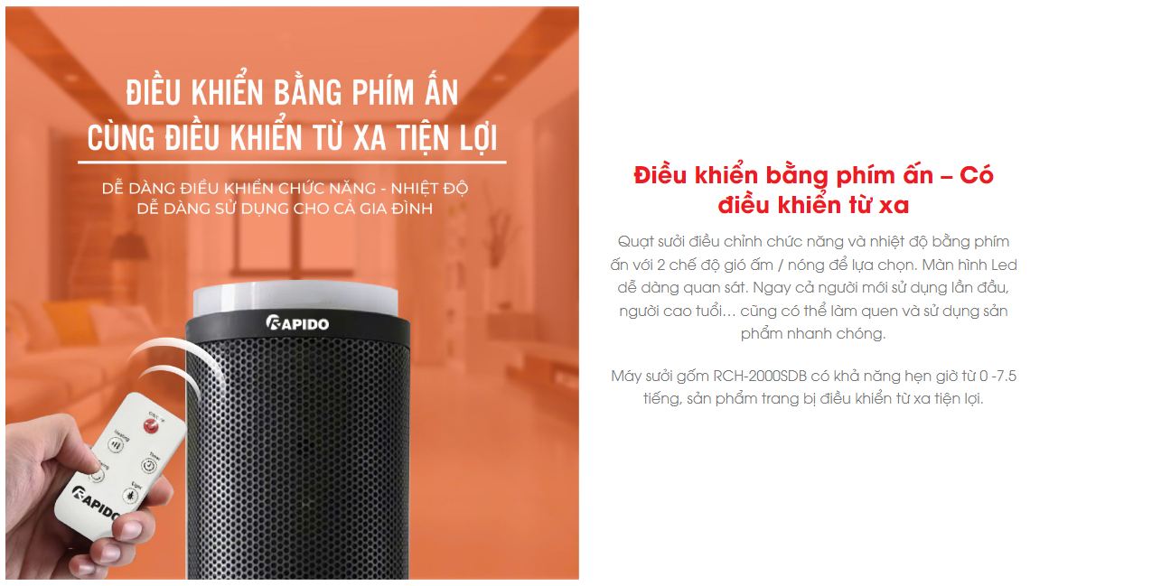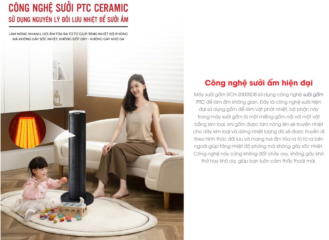 Mùa đông ấm áp với máy sưởi gốm RCH-2000SDB, với khả năng làm ấm phòng nhanh chóng với diện tích làm ấm lến tới 20m2.