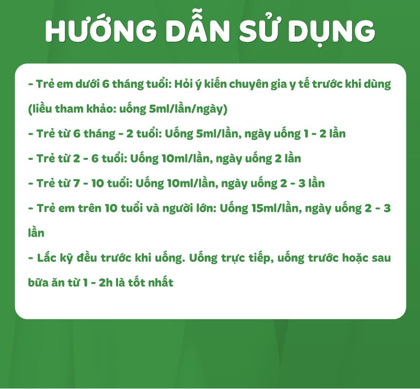 Trẻ từ 2 - 6 tuổi: Uống 10ml/ lần, ngày uống 2 lần.