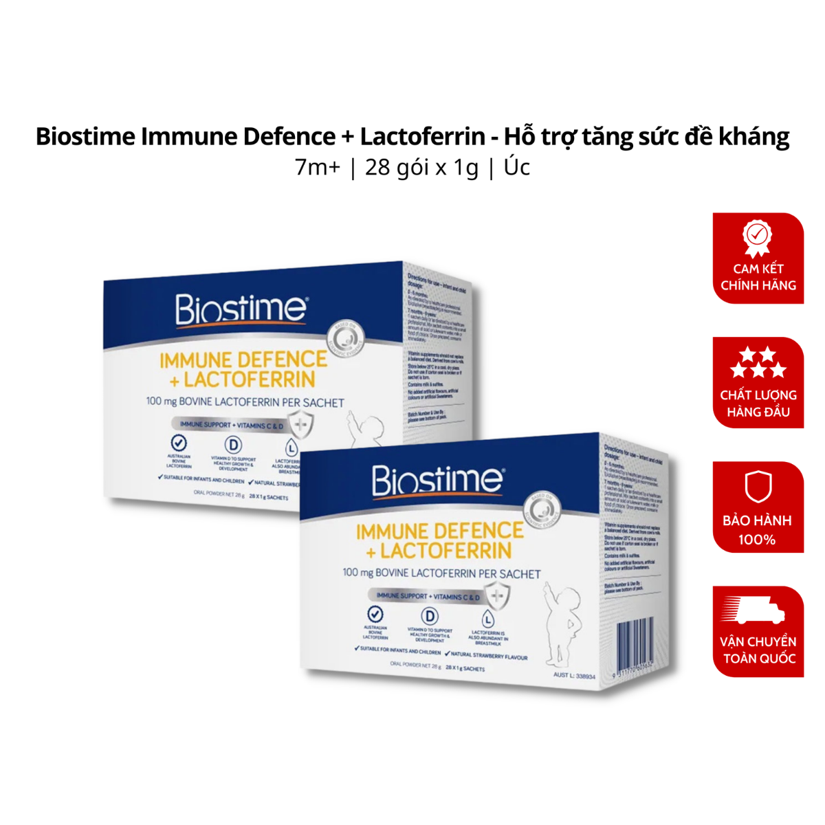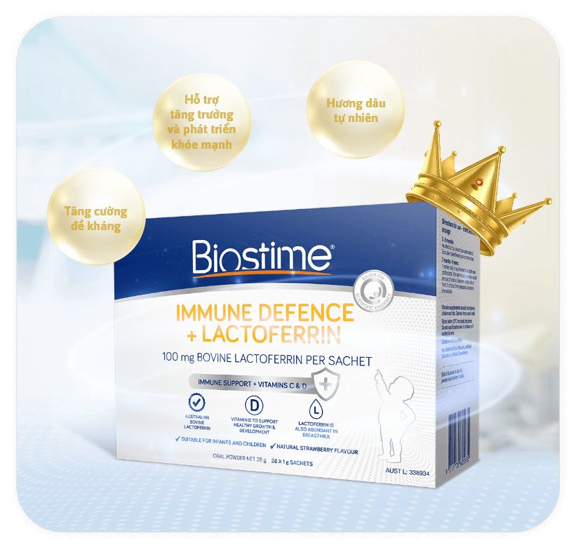 Biostime Immune Defence + Lactoferrin được sản xuất với Lactoferrin từ bò Úc và chứa Vitamin C & D để hỗ trợ hệ thống miễn dịch khỏe mạnh, tăng trưởng và phát triển khỏe mạnh. Lactoferrin là một loại protein có nhiều trong sữa mẹ, đặc biệt là sữa non. Nó có thể ức chế sự phát triển của vi khuẩn có hại trong ruột bằng cách tự gắn vào chất sắt dư thừa trong cơ thể mà vi khuẩn xấu ăn vào.