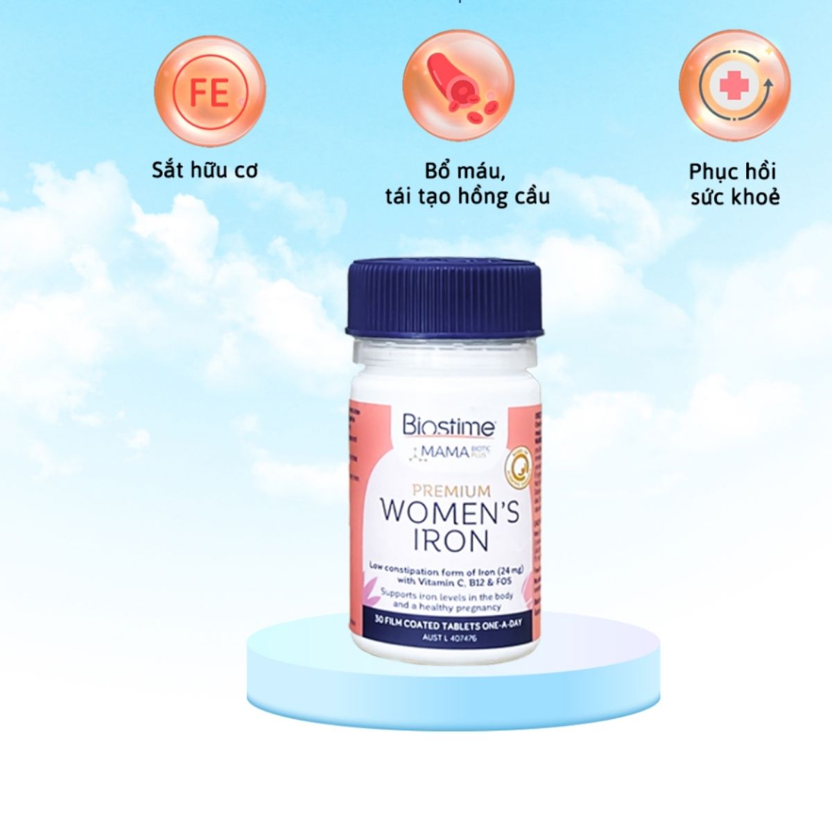 BIOSTIME MAMA BIOTIC PREMIUM WOMEN’S IRON là sự kết hợp giữa sắt, vitamin B12, vitamin C và FOS, tạo thành một công thức hoàn hảo để tăng cường hấp thu sắt và cải thiện tình trạng thiếu máu. Đồng thời, sản phẩm còn kích thích sản sinh hồng cầu, giúp duy trì lượng máu và năng lượng cần thiết cho phụ nữ trong thời kỳ mang thai. Với sự kết hợp lý tưởng của các thành phần thiết yếu và cam kết chất lượng, BIOSTIME MAMA BIOTIC PREMIUM WOMEN’S IRON là lựa chọn hoàn hảo để đảm bảo sức khỏe tốt nhất cho phụ nữ và mẹ bầu.