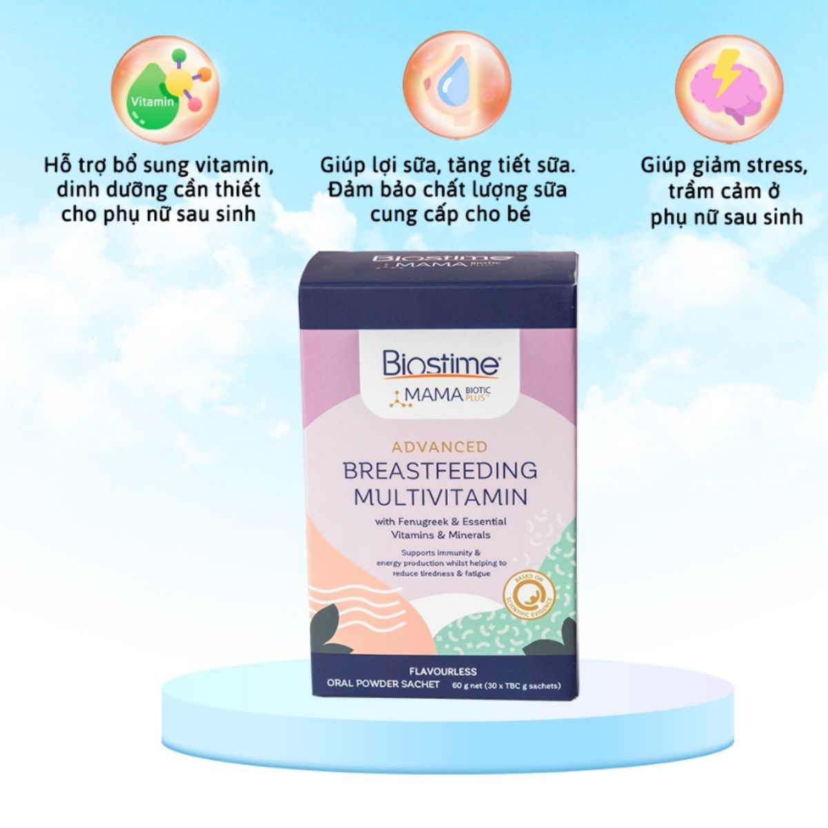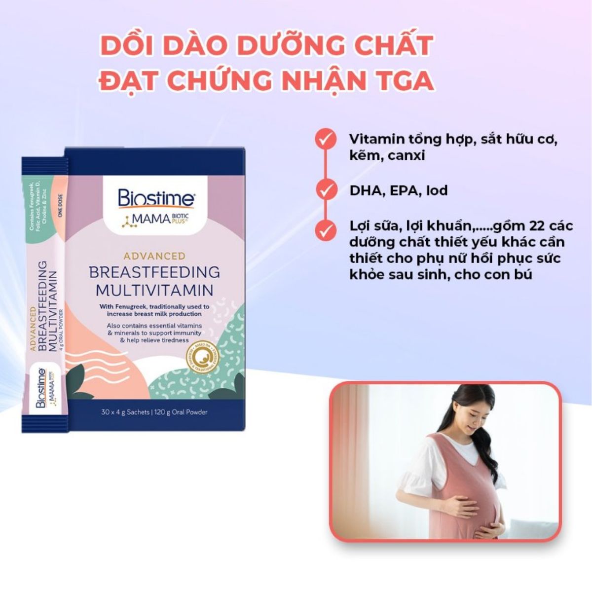 Vitamin Biostime Advanced Breastfeeding Multivitamin là sản phẩm bổ sung dưỡng chất cho mẹ sau sinh, cho con bú giúp bổ sung đầy đủ dưỡng chất và các vitamin cần thiết hỗ trợ cải thiện phục hồi sức khỏe cho mẹ nhanh chóng, giúp lợi sữa và tăng chất lượng sữa mẹ. Sản phẩm không bổ sung hương liệu, không ảnh hưởng tới mùi vị sữa mẹ, được đóng gói sẵn giúp mẹ dùng và mang đi tiện lợi.